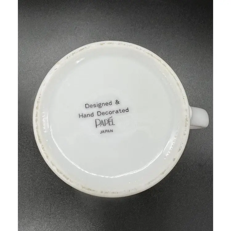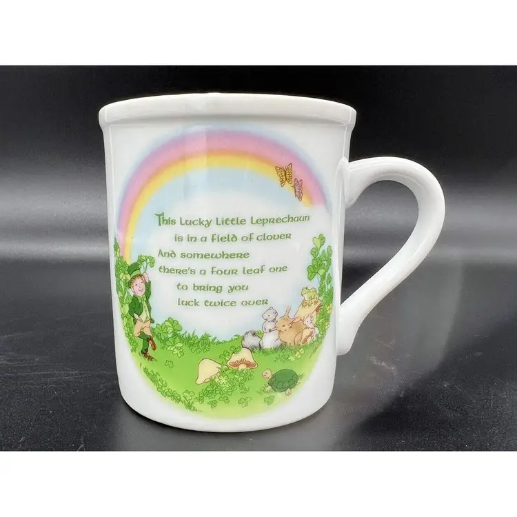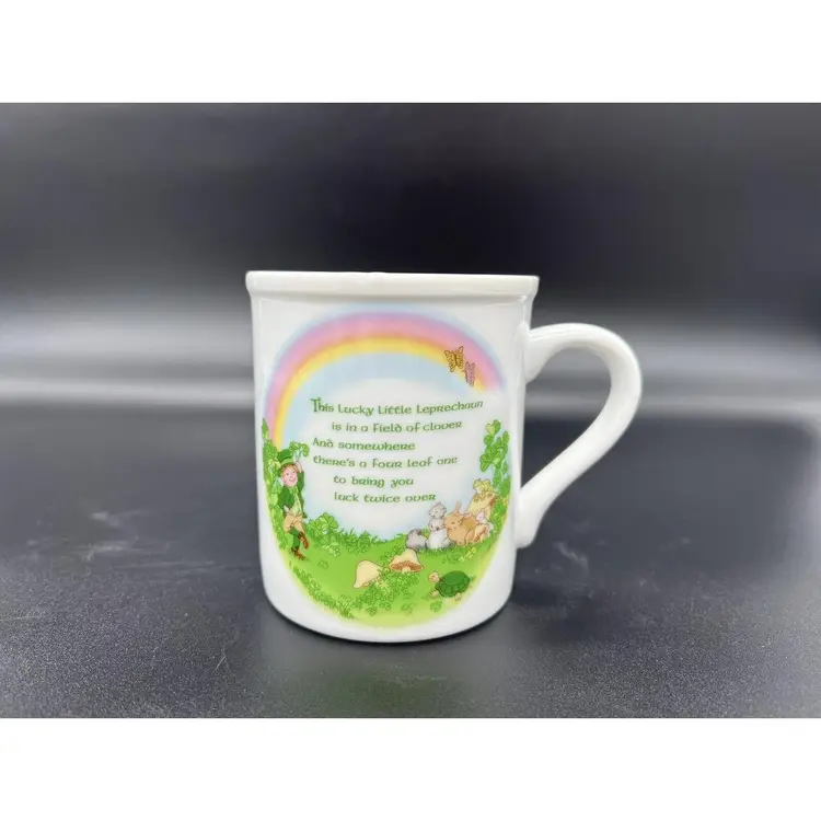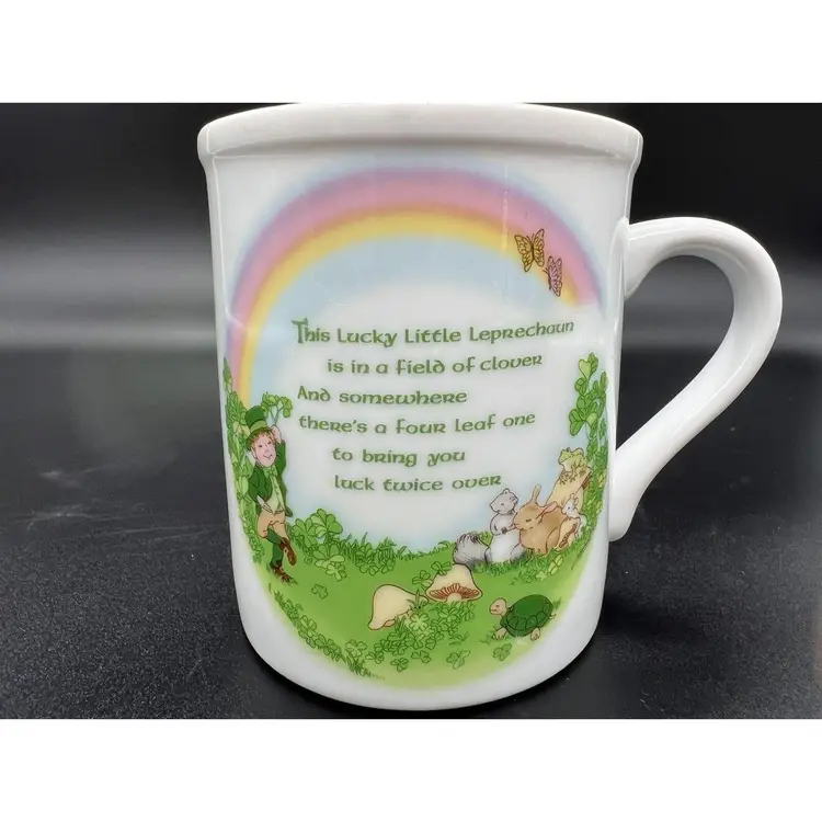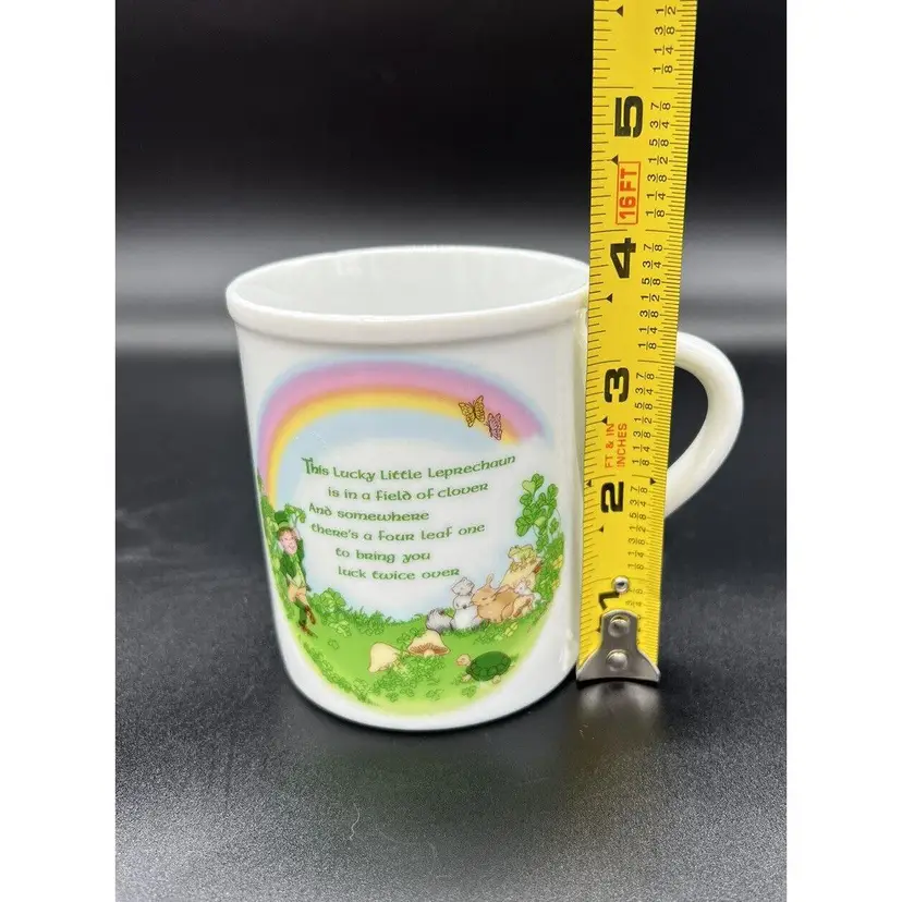 This charming vintage mug by Papel Japan is perfect for St. Patrick's Day or any occasion. It stands at 3 1/2 inches tall and features a delightful Leprechaun Poem. The multicolor design includes a variety of characters such as a turtle, butterfly, mouse, frog, rainbow, mushroom, squirrel, bunny, and of course, a leprechaun. Great condition. No chips or cracks. There is a stain on the edge as pictured.